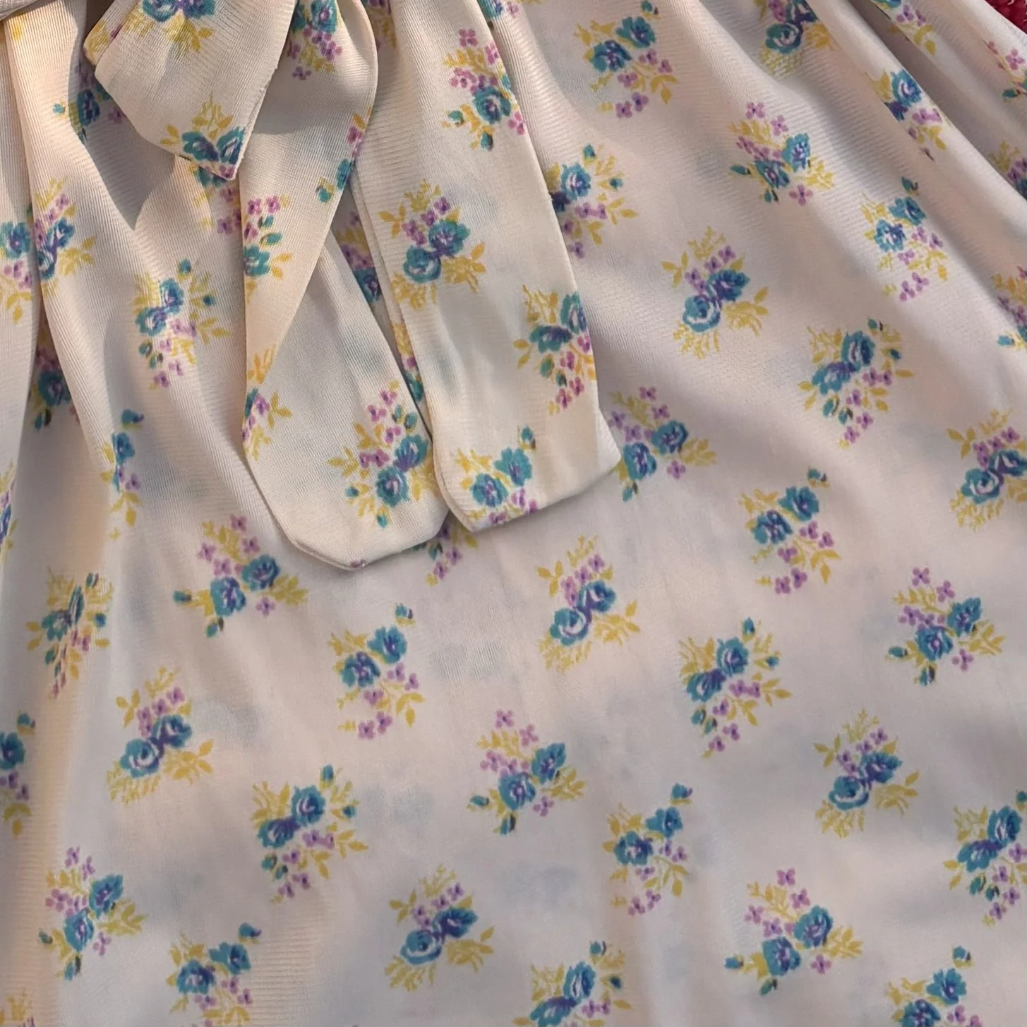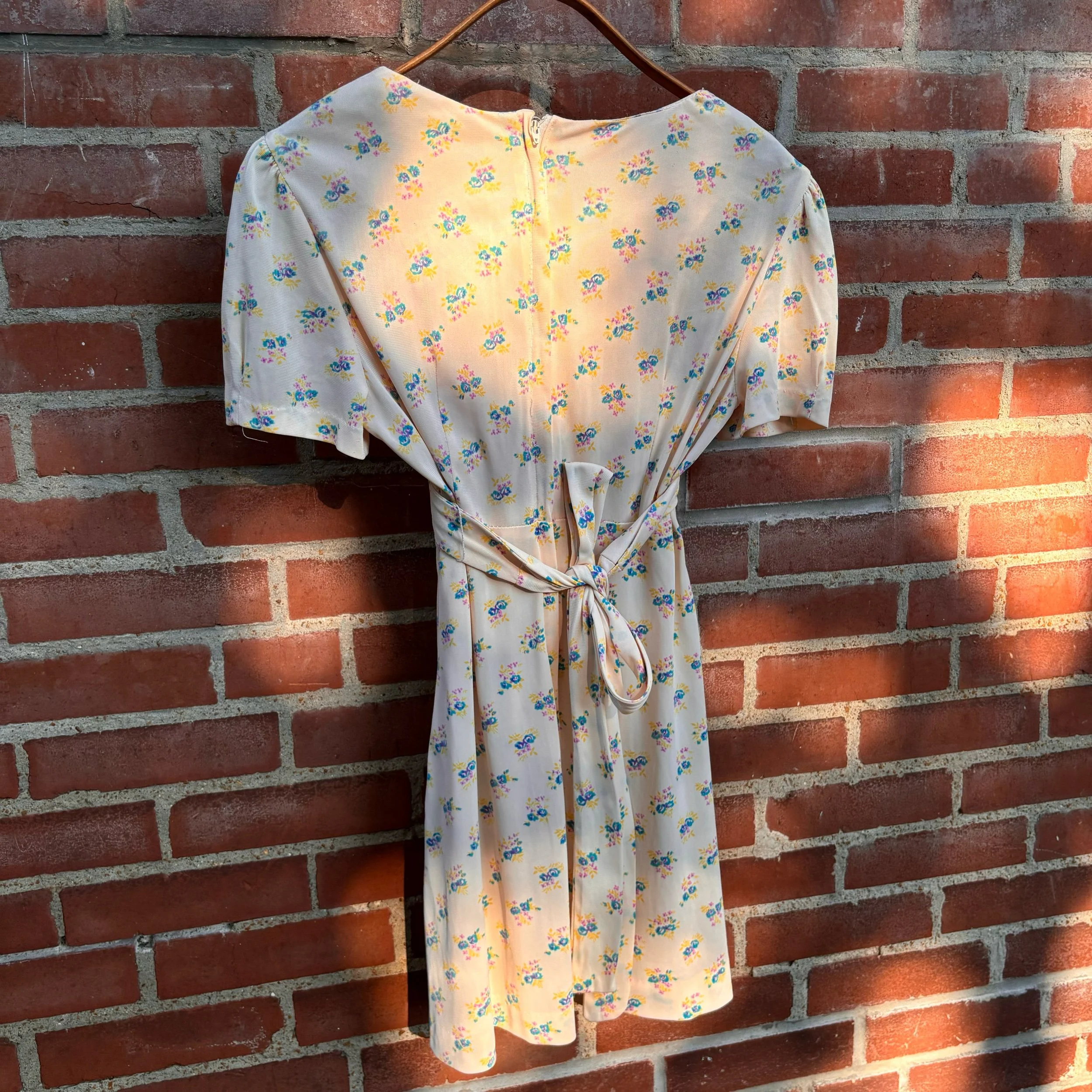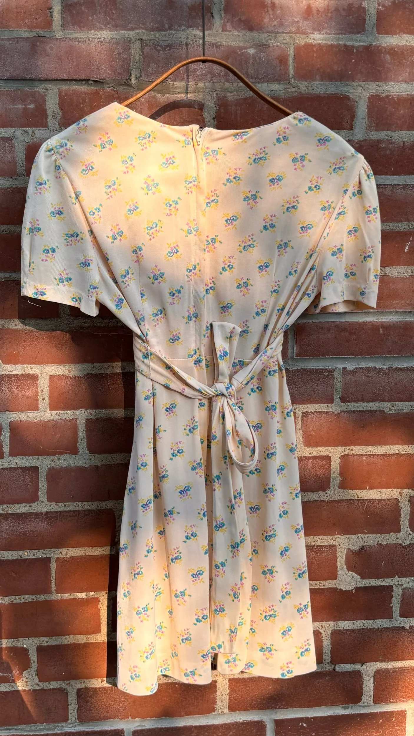 Late 60’s / early 70’s peachy micro floral print wrap dress that can be tied in the back, or wrap around twice and tied in the front.